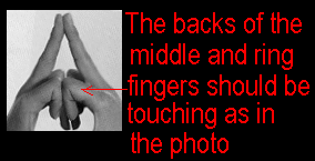 To open the base chakra, place your hands in the position shown in the photo, like the sign of the horns. Your finger pads should be touching, and your thumbs should be touching side by side down to the fleshy part known in palmistry as the "Mount of Venus." This mudra produces a heat sensation in the hands and stimulates the base chakra. Don't worry if you cannot feel the heat sensation, as this takes sensitivity.